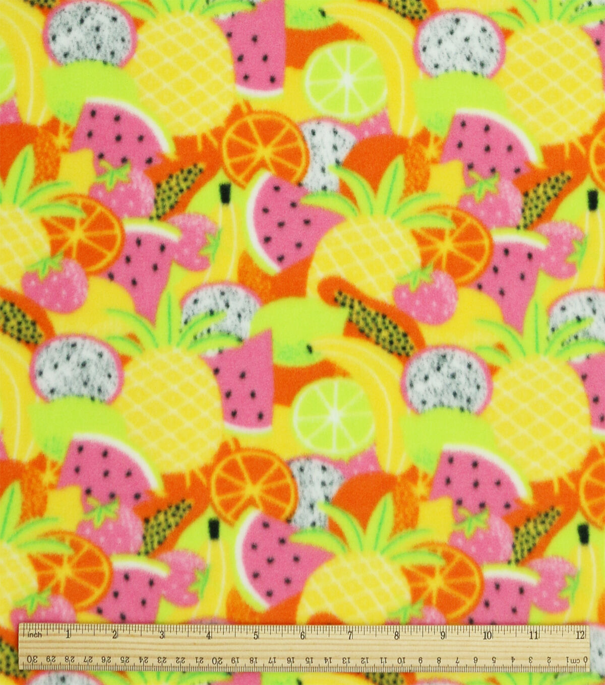Featuring a fun fruit salad print, this fleece is made with 100% polyester and is easy to care for. Simply machine wash normal cold, tumble dry low, and avoid ironing or using nonchlorine bleach to keep it looking its best. Imported for your convenience.