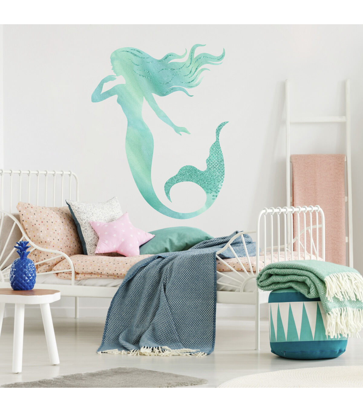 Add magic to your walls with Glitter Mermaid Peel and Stick Giant Wall Decals by RoomMates. Complete with 29 decals, this wall sticker set is a fun and creative way to transform any room in seconds. To apply, simply peel and stick decals to any smooth, flat surface. Remove, reposition and reuse as often as needed. Created with high quality vinyl that's made to last, walls stay completely safe, and sticky residue is never left behind. It's fast, fun and affordable wall decor at it's best.