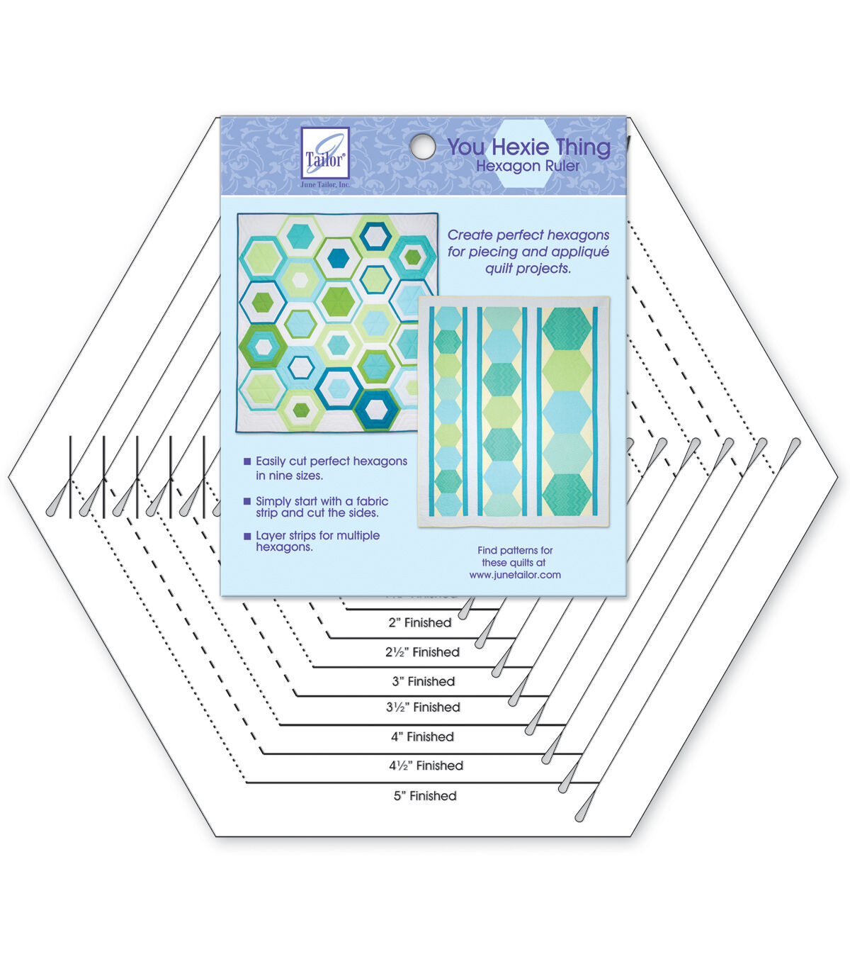 Create perfect hexagons for piecing and applique quilt projects using the June Tailor You Hexie Thing Hexagon Ruler. With this ruler, you can cut nine finished sizes that are 1.5 inches, 2 inches, 2.5 inches, 3 inches, 3.5 inches, 4 inches, 4.5 inches, 5 inches and 6 inches. Start with a strip of fabric, cut two sides, rotate the ruler and cut again. You can layer fabric strips to cut multiple hexagons at a time. This pack also includes easy-to-follow instructions.