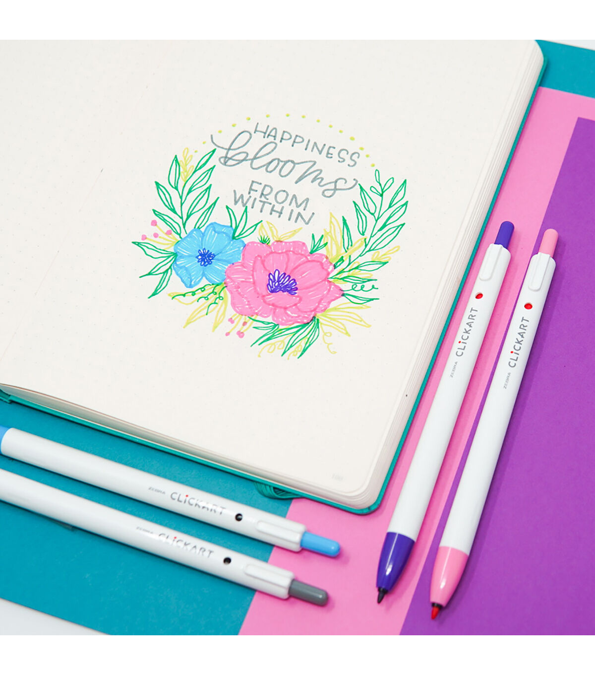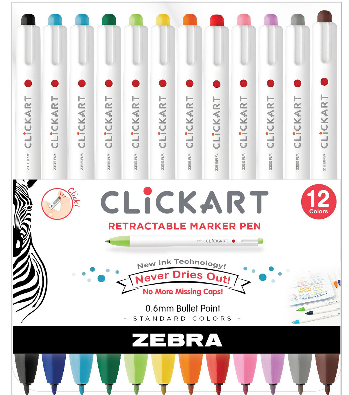 Never worry about ink drying out with the Zebra ClickArt marker pen. The Zebra ClickArt features a capless design and new ink technology that absorbs the moisture in the air, which keeps the ink from drying out. The Zebra ClickArt is perfect for journaling, color coding, drawing, and everyday writing. With a satisfying click and the relief of not having to worry about misplacing the cap, the ClickArt marker pen is a perfect companion for your creative projects.
