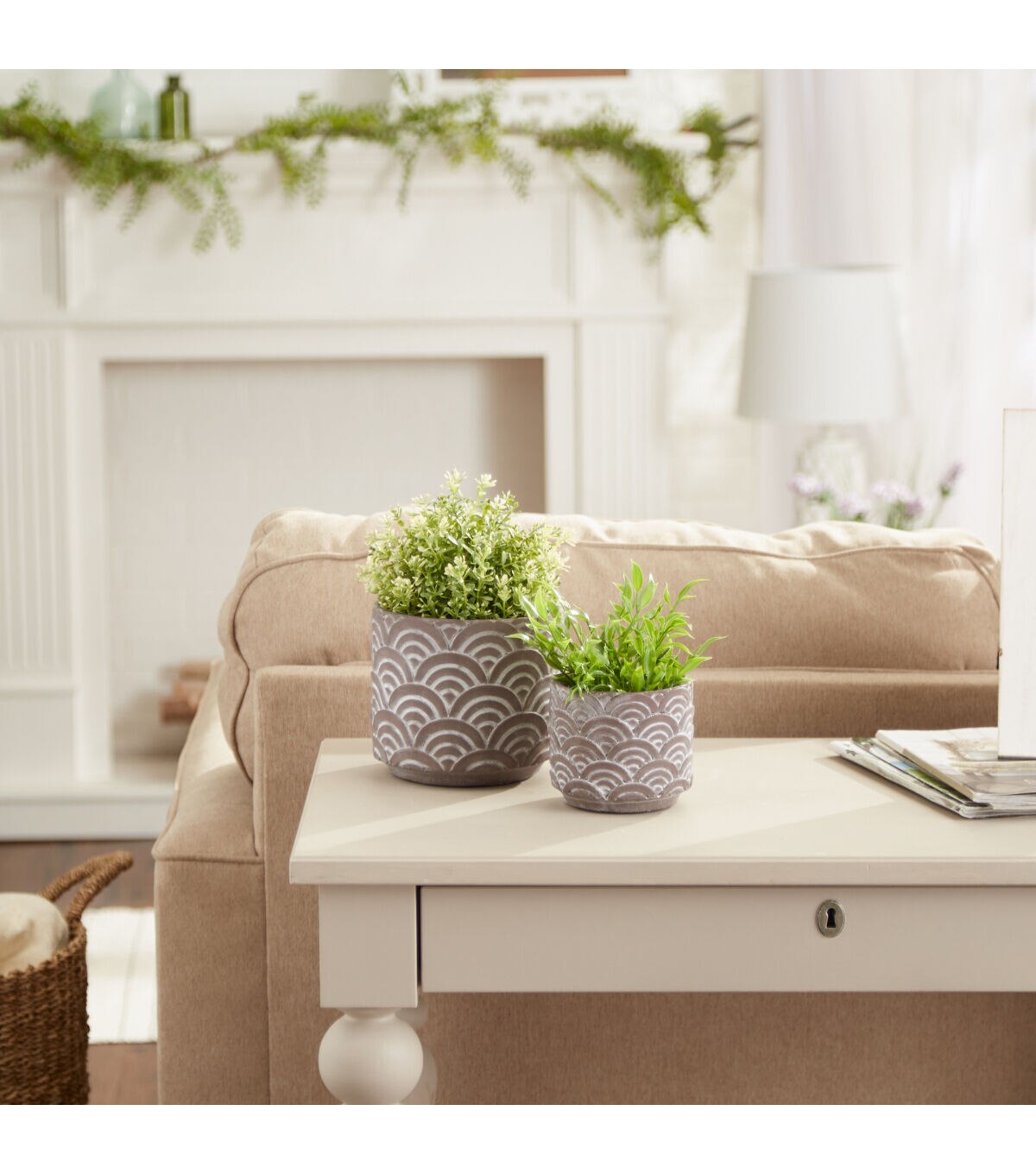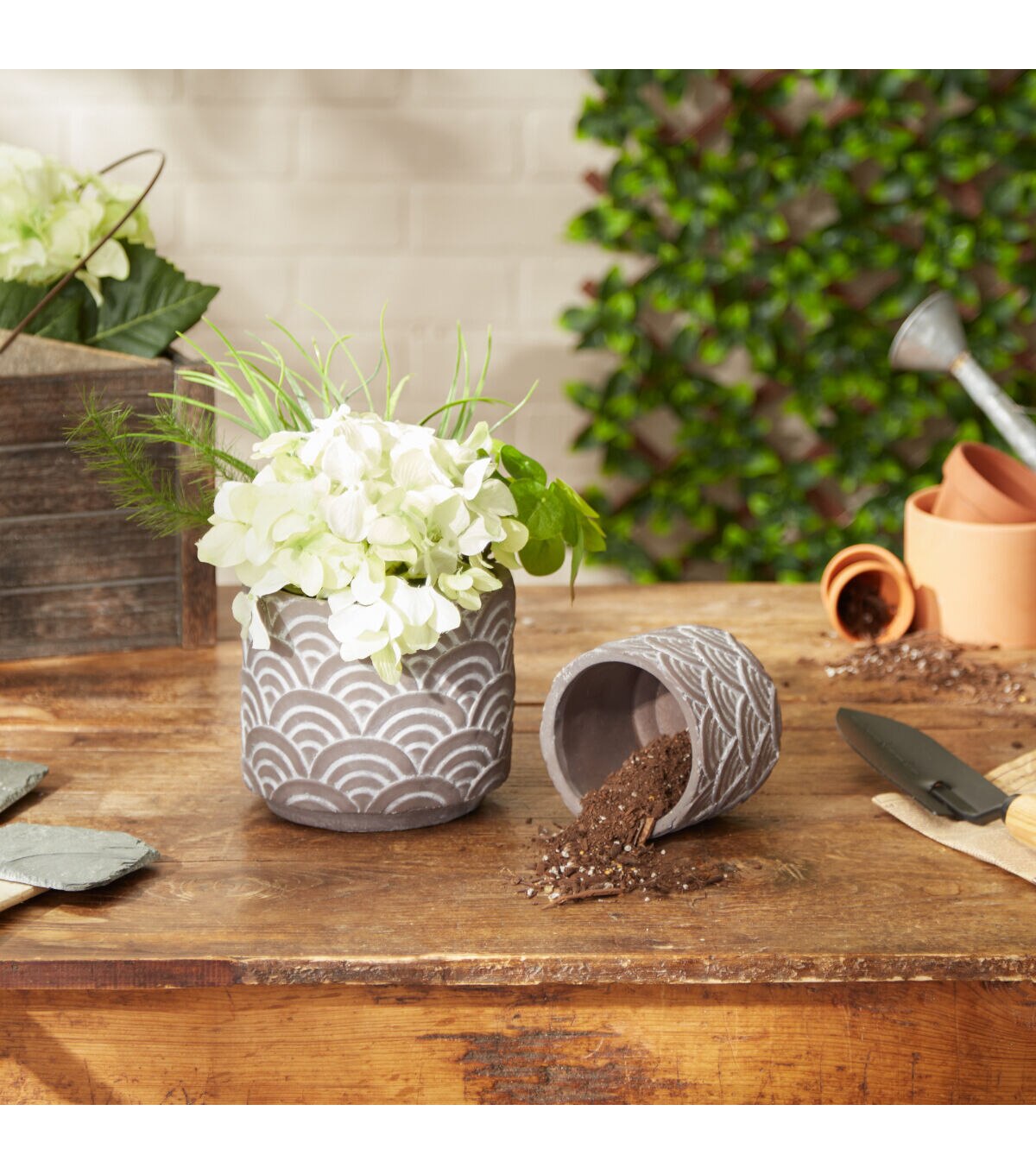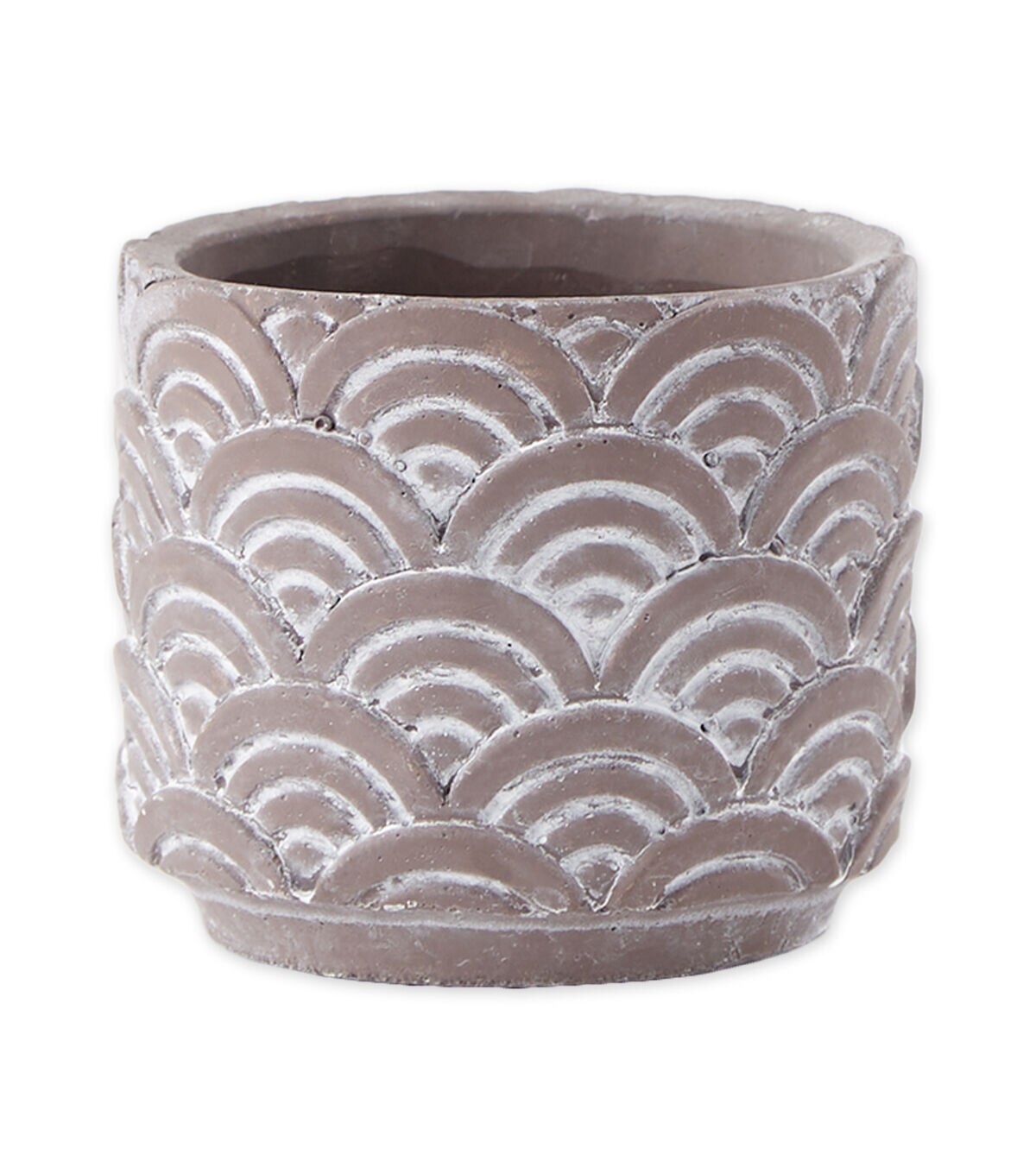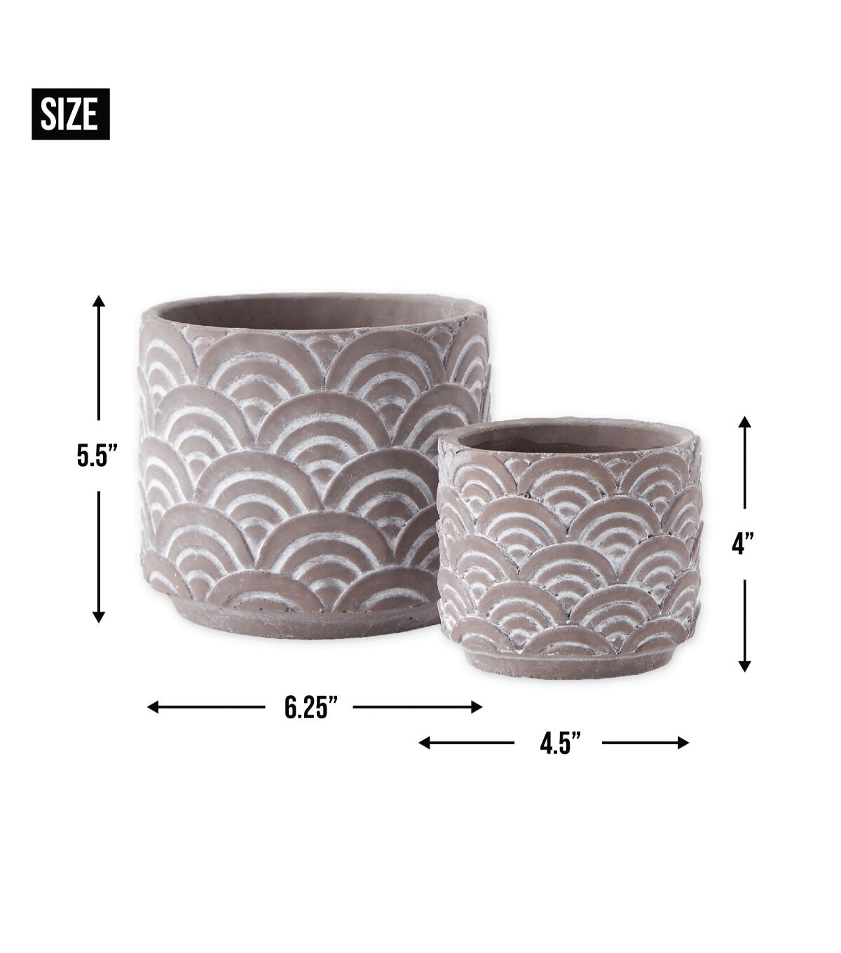 These unique pots which feature a geometric scallop design can be used for both indoor and outdoor plants and flowers. Set of 2 cement pots includes 1 each large and small pot. The Large Pot measures 6.25"x6.25" x5.5" and the Small Pot measures 4.5"x4.5"x4". Made of durable and long lasting cement, these pots will beautifully and securely display your flora. These pots have no drainage holes. Each pot has foam feet to prevent scratching surfaces. Beautiful but subtle designs allowing your plants and flowers to stand out. Wipe clean with damp cloth. Avoid using abrasive materials that may scratch the pot. Set nests for smaller footprint when storing.