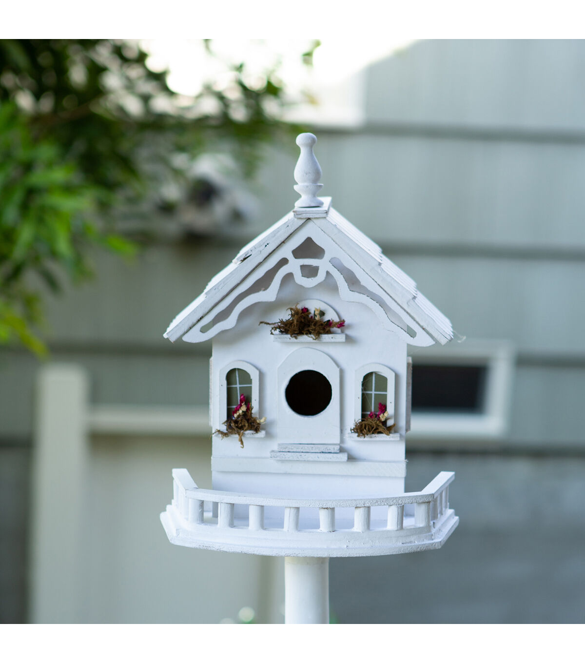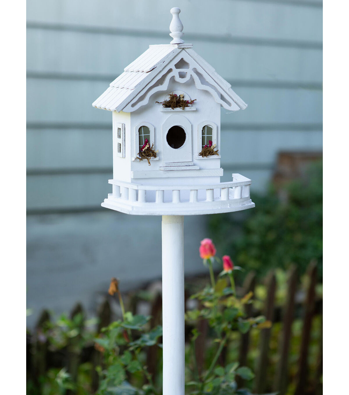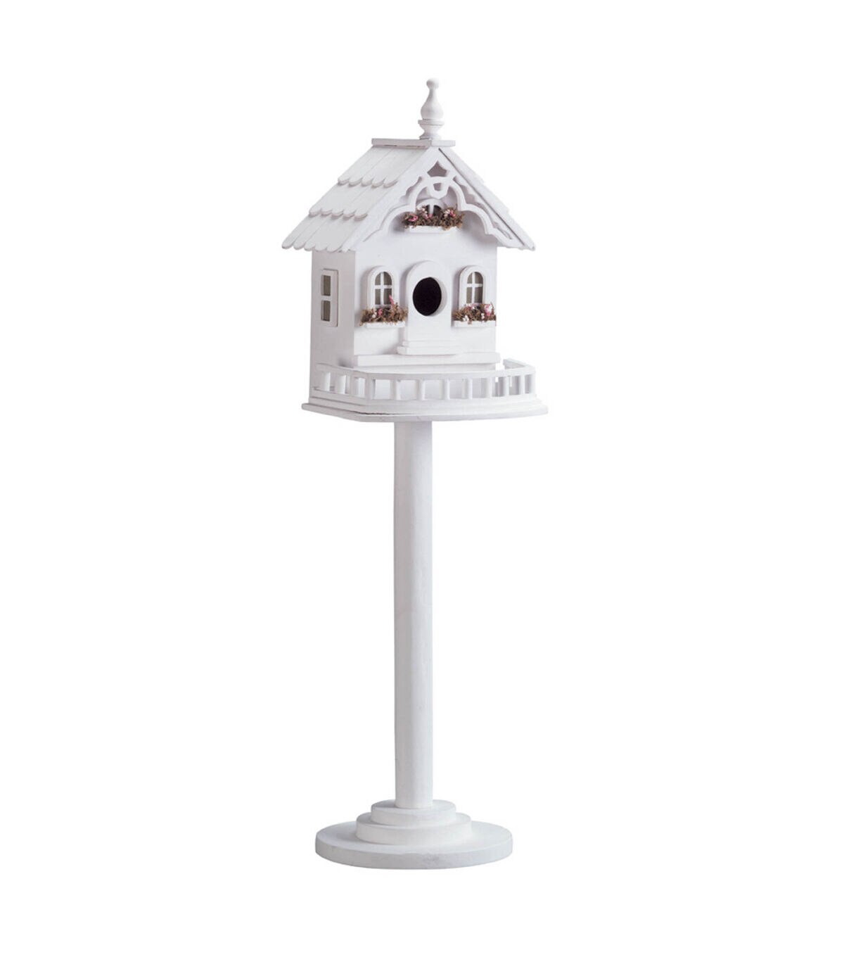 - Lovely little luxury villa with flower boxes and detailed wooden trim for feathered flyers overflows with Old World charm! Sturdy freestanding pole and base included.
